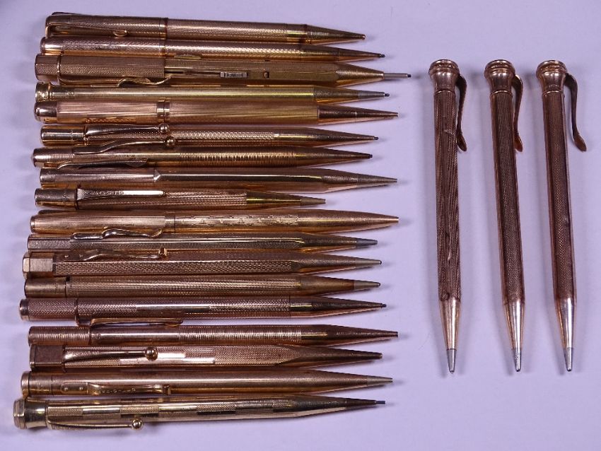 TWENTY-ONE ROLLED GOLD VINTAGE PENCILS by Yardol Lead, Eversharp, Life Long and others, three marked 'Guaranteed 14ct rolled gold'