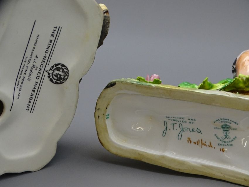 FRANKLIN MINT 'The Ring Necked Pheasant Figure' by A J Redisill, 34cms H and Crown Staffordshire porcelain bullfinch figure, 16cms H, both on wooden plinths
