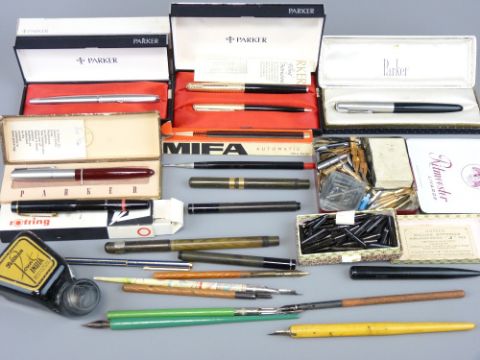 VINTAGE PENS, DRAWING INSTRUMENTS, ASSOCIATED NIBS & MATERIALS, a quantity to include a De La Rue & Co London, Onoto with gilt bands, engraved 'F Bullock' boxed Parkers, boxed Rotring radiograph fountain pen ETC