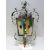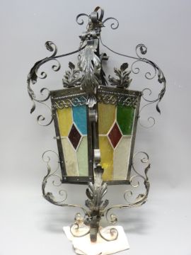 VINTAGE STYLE WROUGHT IRON & COLOURED GLASS HALL LANTERN, 66cms H