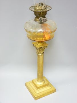 VICTORIAN OIL LAMP with clear glass facet cut font on a Corinthian column brass base, 79cms overall H top of funnel