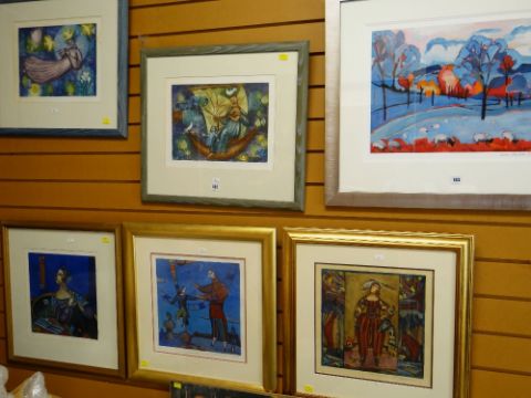 ASSORTED PICTURES & PRINTS including VERONIQUE GIARRUSSO set of two limited edition (9/100), (6/100) colour etchings - entitled 'The Madolin Player', 'Ondes', 29 x 37cms together with JEAN MILLER limited edition (33/100) colour print - landscape with trees and sheep, signed, 38 x 47cms and THREE LIMITED EDITION THEATRICAL PRINTS, signed, one dated '93, artist unknown
