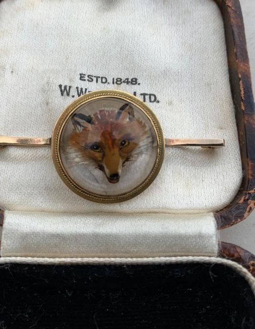 REVERSE CARVED INTAGLIO ESSEX CRYSTAL FOX HEAD BROOCH marked 9ct gold, Chester mark, maker William John, Birmingham, Penow