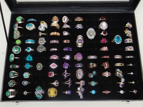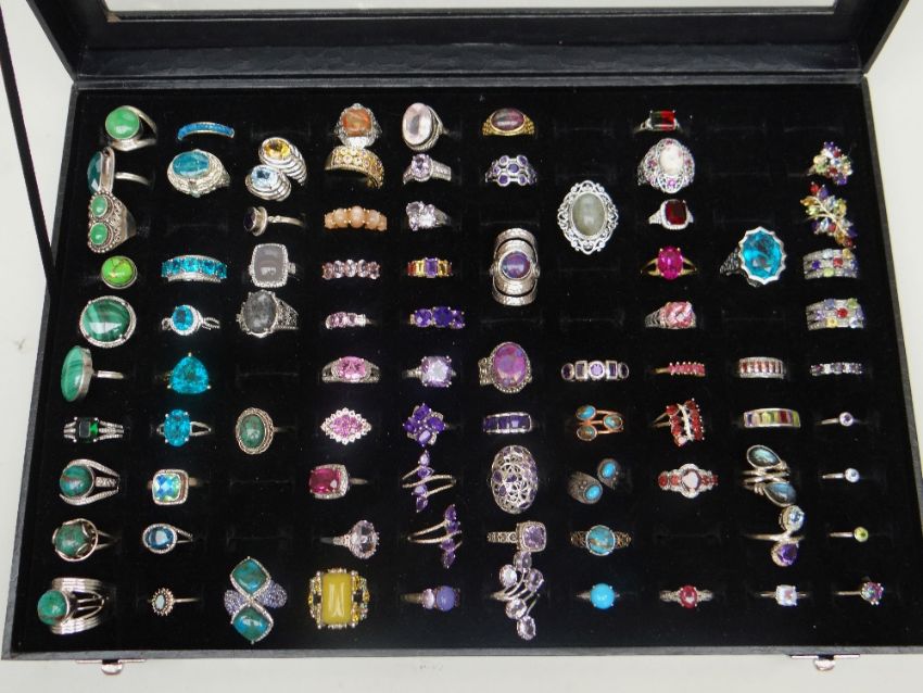 TRAY OF MODERN SILVER SET RINGS WITH SEMI-PRECIOUS STONES, (80 approx.)