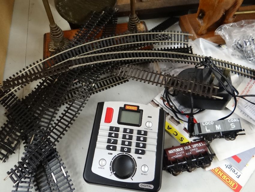 TWO DECORATIVE DINNER GONGS, LARGE WOODEN CARPENTER'S CLAMP, DISNEY CARS MICRO SCALEXTRIC ETC.There are no trains included with the hornby just track, the controller and two carriages.