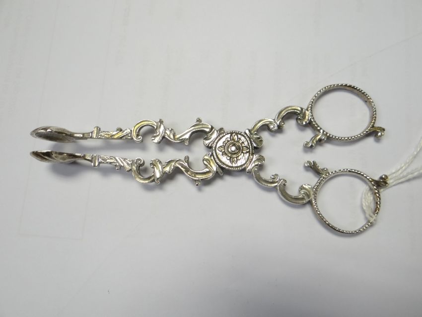 BELIEVED 18TH CENTURY IRISH SILVER SUGAR NIPS, of scissor action design with shell shaped bowls and 'C' scrolls. Dublin, date letter rubbed, 12.8cms long, 1.17ozsno signs of soldering or repair
