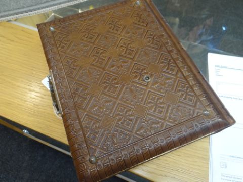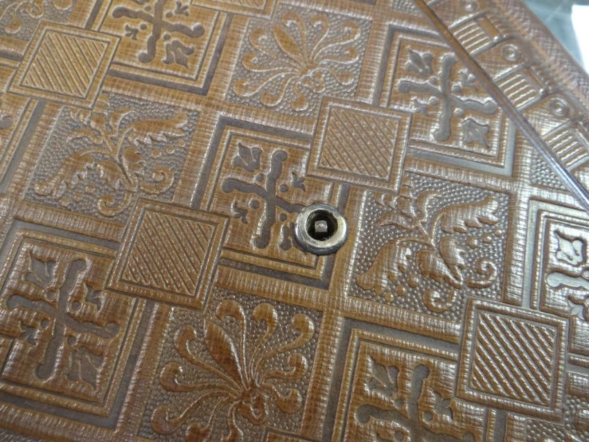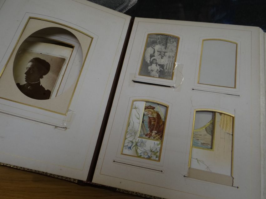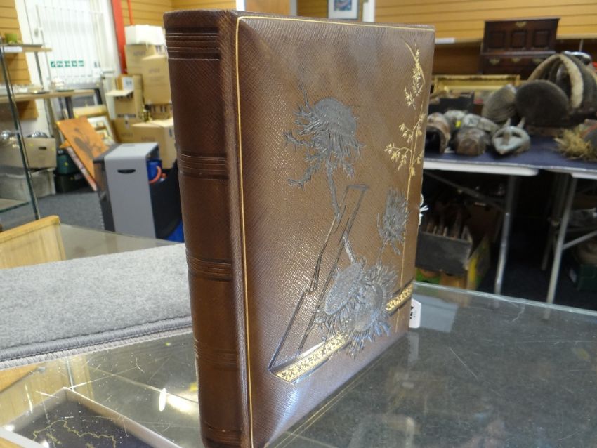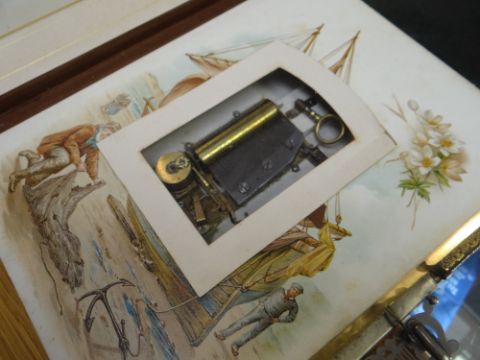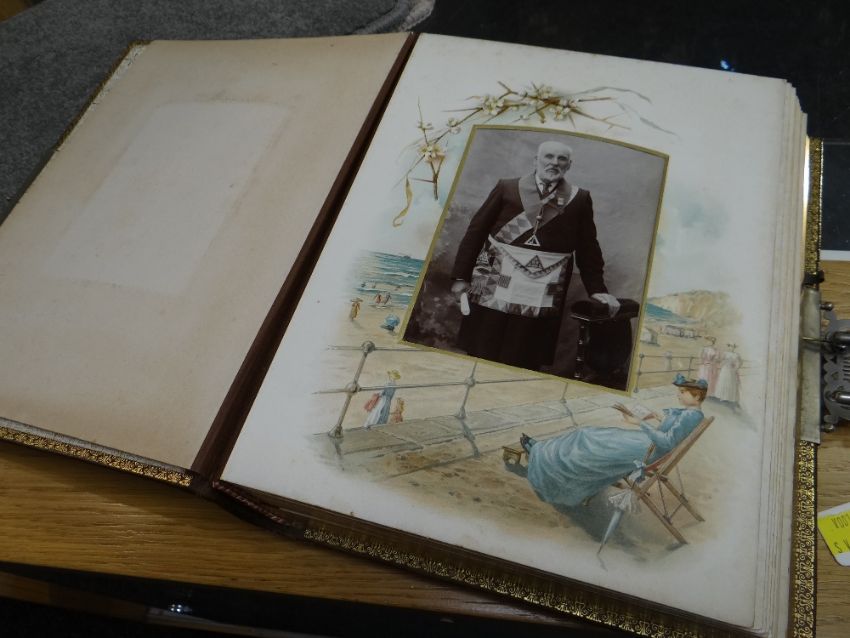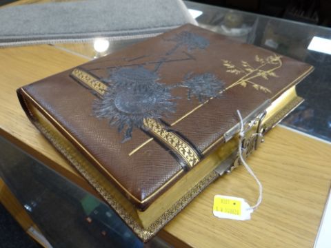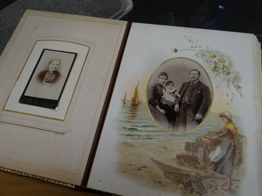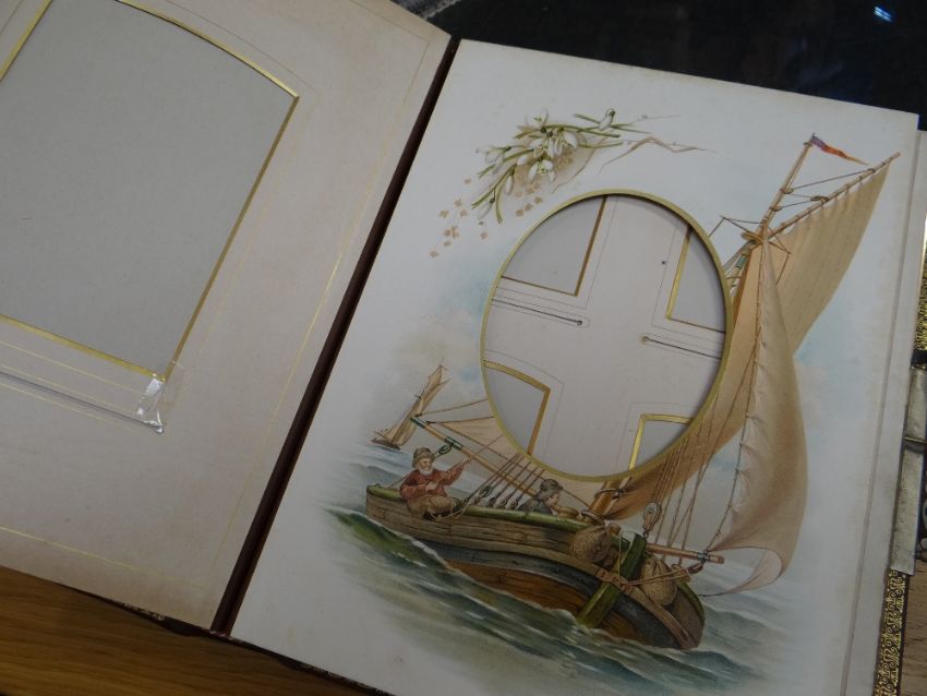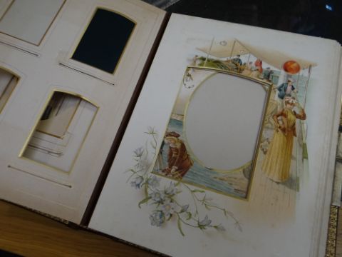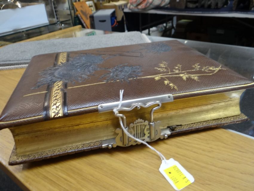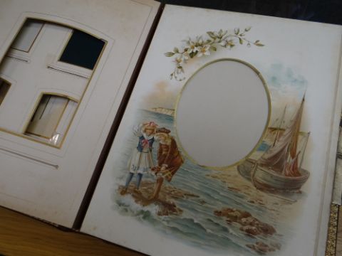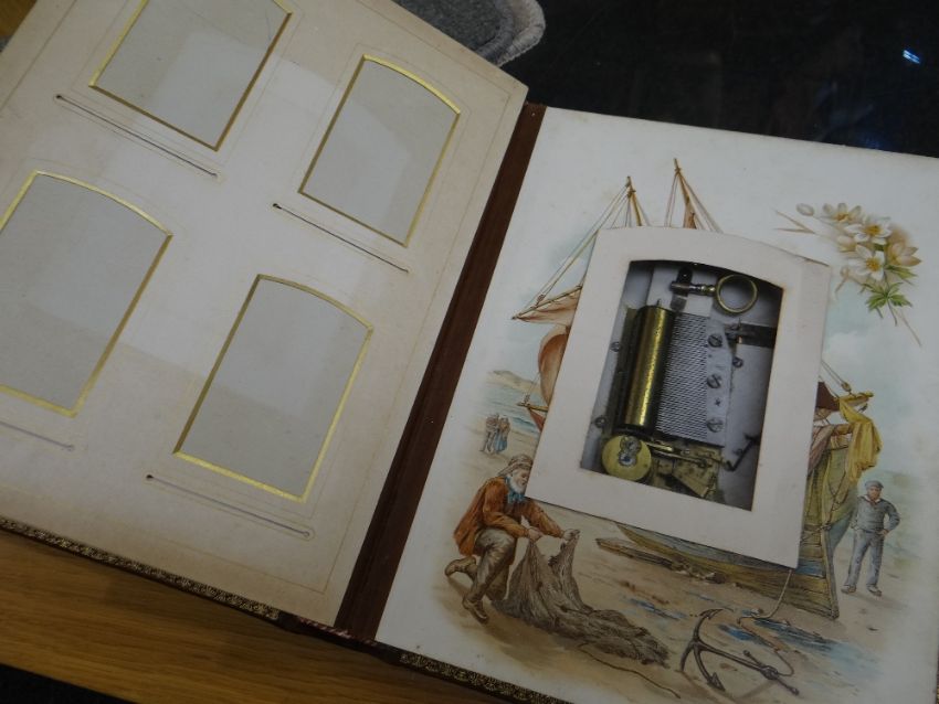 VICTORIAN LEATHER BOUND MUSICAL PHOTOGRAPH ALBUM containing small cylinder music box