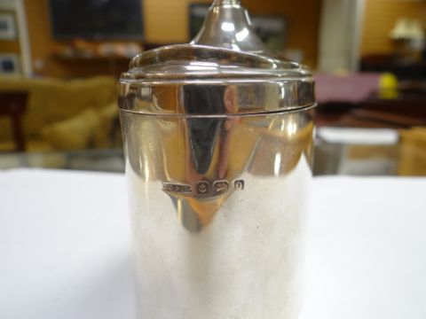 GEORGE VI SILVER OVAL TEA CADDY, Birmingham 1968, 3.9ozs. 9cms high, 10cms wideThe height is 10cm’sThe width is 8.5cm’sThe depth is 5.5cm’sThere is no damage, dents or dings.The hinge feels and looks good. It opens and closes nicely.It does not feel thin.I could see any marks on the finial, just hallmarks on the side of the body and under the lid.