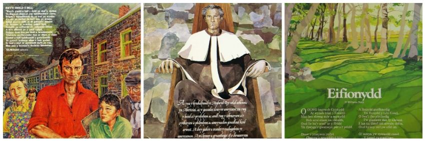 SUSAN SHIELDS three Welsh Arts Society posters - with Welsh language poetry text entitled (1) 'Eifionydd' by Robert Williams Parry (2) 'O Brut y Tywysogau' (The Chronicle of the Princes) by T Gwynn Jones CBE, and (3) 'Rwy'n Gweld o Bell' (I see from afar) by Thomas Evan Nicholas, 76 x 51cms