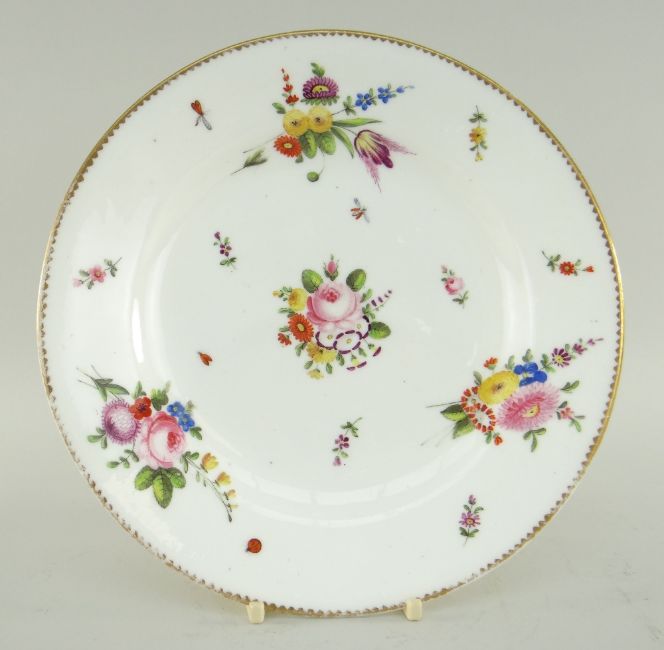 NANTGARW PORCELAIN PLATE painted with sprays of colourful flowers and insects, gilt dentil rim, impressed mark NANT GARW CW to base, 21cms diam