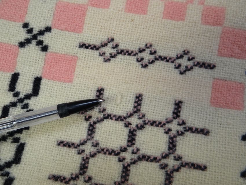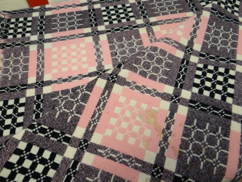 VINTAGE TRADITIONAL WELSH WOOLLEN BLANKET with pink and black geometric design to a cream ground, corresponding three colour fringe, 208 X 160cms Provenance: passed through 'at least three generations', Swansea familyThere is some staining