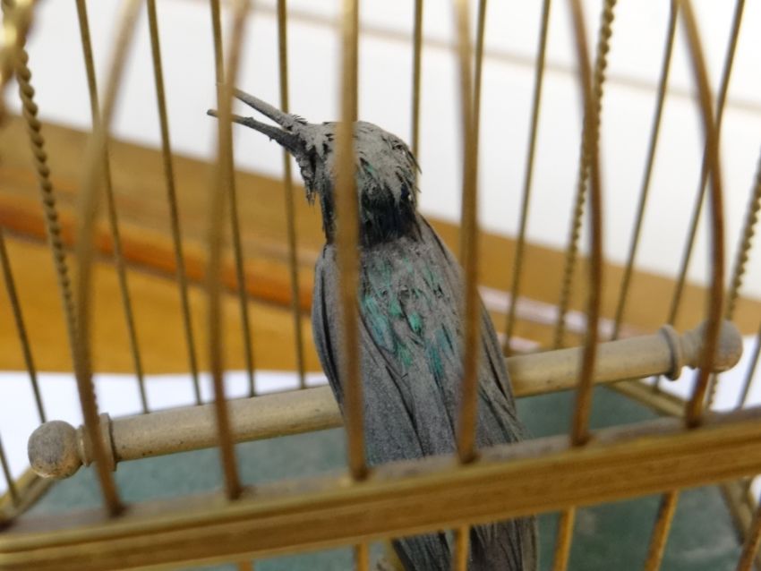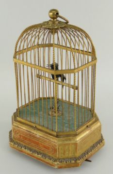 A SINGING BIRD AUTOMATON, FRENCH EARLY 20TH CENTURY green feathered hummingbird type with beak, head and tail movements, under gilt brass cage and gesso base, 27cms highThe bird has lots of feathers missing and is very dirty.There is also some missing cage decoration at the bottom of the bird stand/perch.It winds well and the automation works nicely, the birds sings and moves its head.There is general wear all over, gilt loss to the cage and stand, all feet are present.