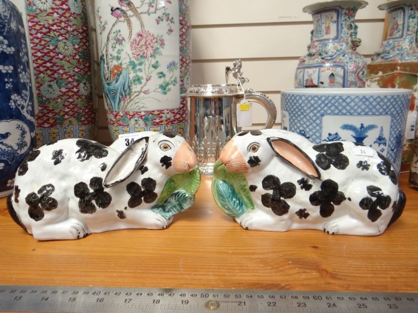 RARE PAIR OF VICTORIAN STAFFORDSHIRE POTTERY MODELS OF RABBITS, recumbent with lettuce leaves in their mouths, 24cms long (2) Condition Report: minor flaking to green enamel, glaze with characteristic craquelureBoth have chipped enamel to lettuce leaves, one has glaze chip to rear ear, both have burst glaze bubbles to the black patches. One has firing crack to rear rump. Slight painting differences suggest these may be a “matched” pair.