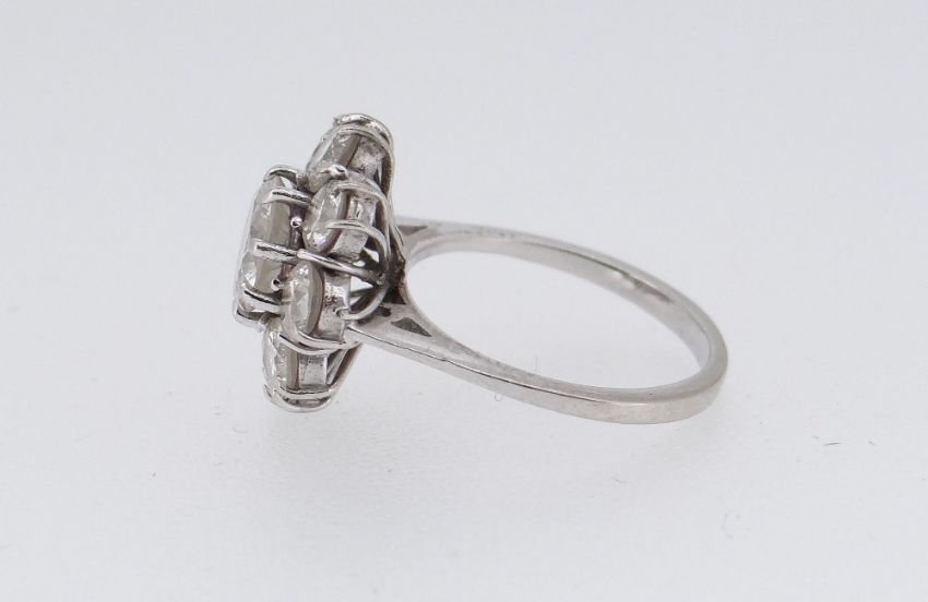Condition Report: small chip to central stone on outside of table. Feather (crack) to central stone. Evidence of clouds, black mineral deposits and feathers to surrounding stones. Viewing encouraged. Box worn and torn.