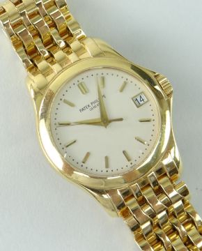 PATEK PHILIPPE CALATRAVA, REFERENCE 5107/1J-001, 18CT GOLD WRISTWATCH movement no. 3249075/4164687 calibre 315/190 SC Automatic 30 jewels movement, sweep centre seconds and date, with integral 18ct yellow gold brick work bracelet stamped Patek Philippe, Geneva, in original box and outer box with watches of Switzerland sale receipts, certificate of origin Patek Philippe certificate, booklets etc, also comes with a Rapport of London watch box Autioneer's Note: The Calatrava is one of the most coveted and elegant dress watches ever produced with an emphasis on 'less is more'. An understated and timeless piece made by one of the most globally respected luxury watch makers. Condition Report: in good overall condition, seconds hand running, minor surface wear and minor scratches but a very good example indeed.few light surface scratches to the bezel and the inside of the strap