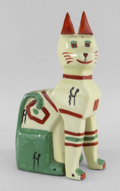 PORCELAIN LOUIS WAIN 'EGYPTIAN CAT' C.1920, a small figural vase modelled as a seated cat, red green details and black 'meow meow' notes on a cream ground, signed 'Louis Wain' with reg. no 638318 and backstamps, 15cms high