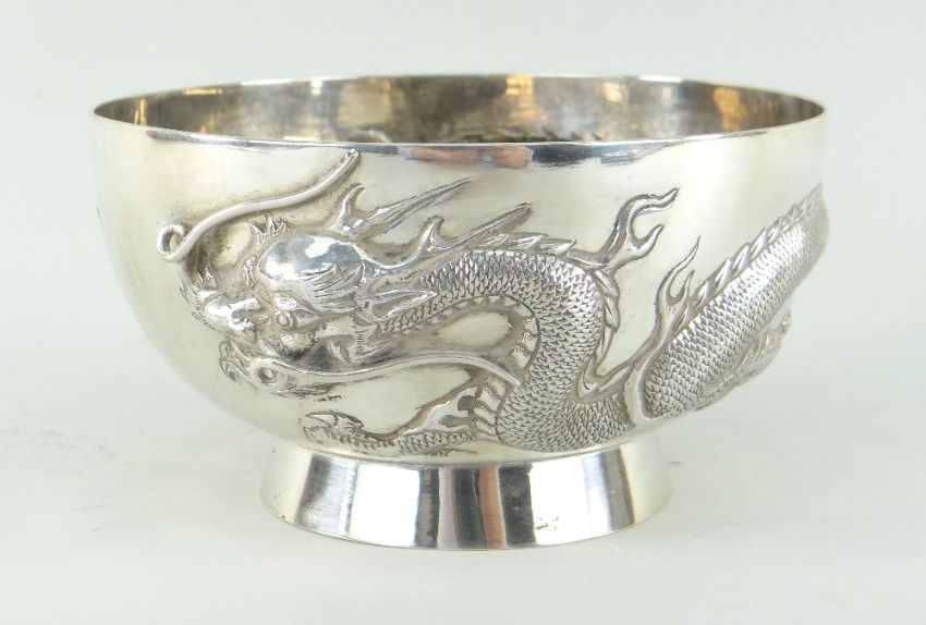 CHINESE SILVER BOWL BY CHEUNG SHING, c.1920, repousse decorated with a single four-clawed dragon with whiskers in high relief, on flared foot, stamped mark and with two characters, 12.7cms diam., 175g approx. (5.6 troy oz.)