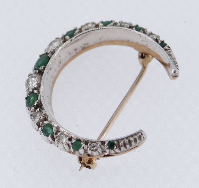 9CT GOLD EMERALD & DIAMOND CRESCENT BROOCH set with nine graduated emeralds and eight graduated diamonds, 6.1gms. Condition Report: appears in good overall condition with no stones missing. Clasp in working order.the brooch is 27mm in diameter
