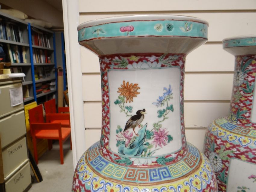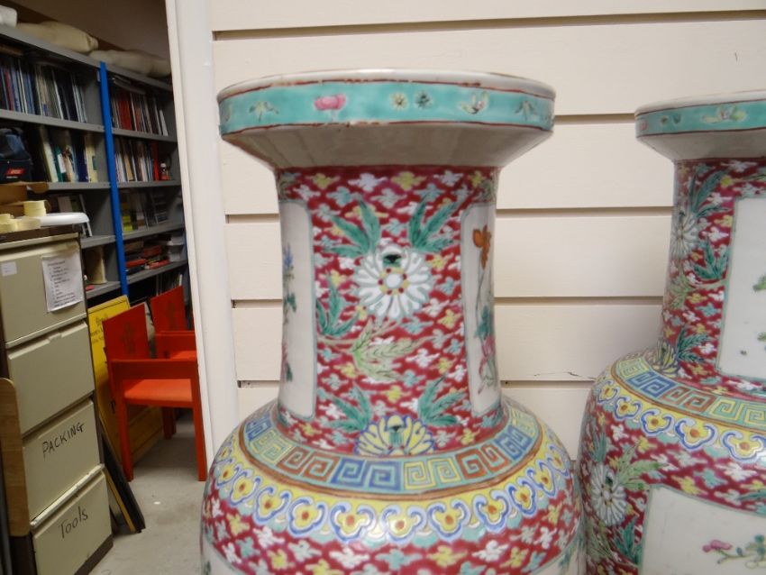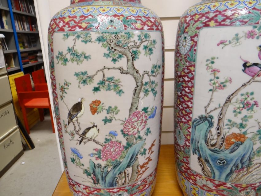 PAIR CHINESE FAMILLE ROSE PORCELAIN ROULEAU VASES, 19th Century, well painted with large opposing panels of flowering prunus tree and chrysanthemums with long-tailed pheasants, and with maple tree and peonies with minor birds, smaller panels of egrets and lotus at the neck, reserved on a deep red diaper ground with scattered stylised lotus, lappet collar to foot, 64.5cm high (2) Condition Report: Star crack to base of one