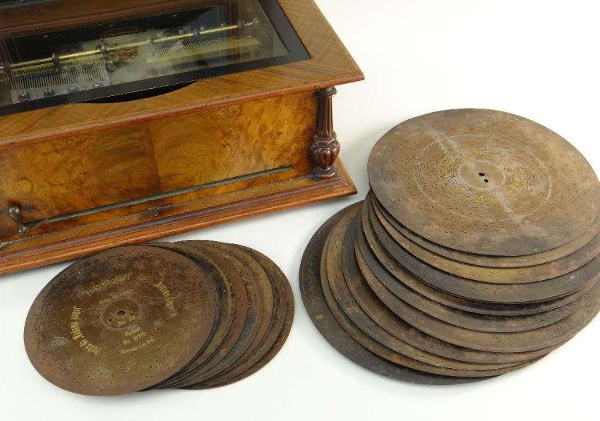 SYMPHONION NO.25 WALNUT MARQUETRY TABLE TOP DISK MUSICAL BOX CIRCA 1890, for 8 1/4 / 11 3/4 inch disks, double comb sublime harmony arrangement, leaver wound, lid with floral and bird marquetry decoration, serial number 77647, retailers label Freedman & Sons, Swansea, 49.5cms wide, together with 19 large and 10 small disks