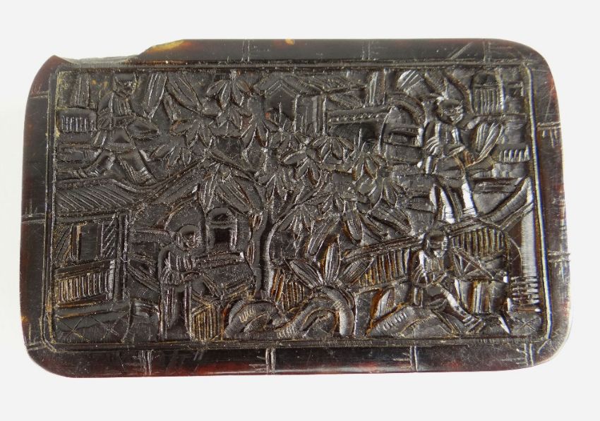 CANTONESE TORTOISESHELL SNUFFBOX, c.1880, intricately carved to the cover, base and sides with figures in landscapes, brass hinge, 7 x 4.8 x 2cms