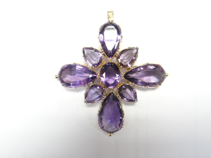 BELIEVED LATE 19TH CENTURY/EARLY 20TH CENTURY AMETHYST & GOLD PARURE, the necklace composed of nineteen graduated oval amethysts (43cms long), en suite with removable nine stone cross pendant, eleven stone bracelet, pair of drop earrings, and small oval stone bar brooch. Together with similar yellow metal and amethyst bar brooch in filigree setting, all in fitted box.