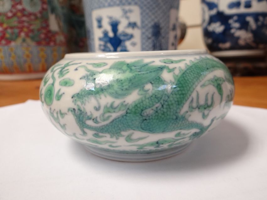 CHINESE DOUCAI PORCELAIN BRUSHWASHER decorated with two confronting five-clawed green dragons chasing the flaming pearl, base bears six character Kangxi mark, 12.5cms diam.
