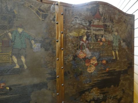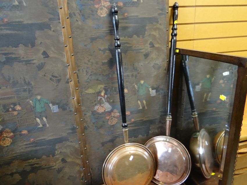 ASSORTED DECORATIVE FURNISHINGS including four leaf Chinoiserie printed screen, two copper warming pans, tool chest and mirrorThe screen has a few holes but they do not go right through, they are just on the back of the screen.The colours have faded in places and is very dirty.There are no tools in the tool box, it is empty