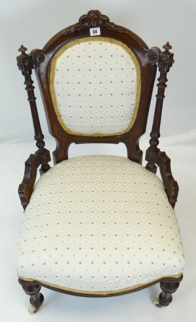 THREE LATE VICTORIAN WALNUT NURSING CHAIRS, similarly upholstered on turned fluted legs with ceramic casters (3)