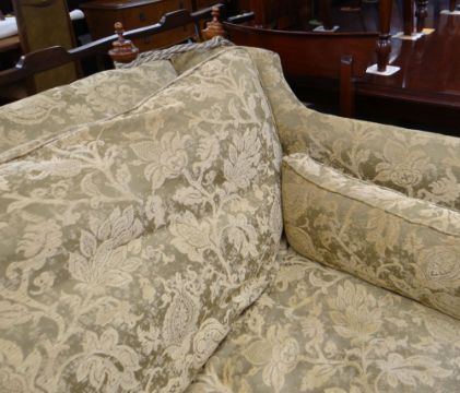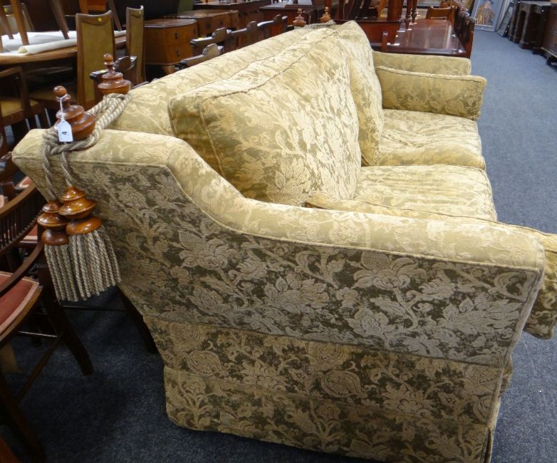 MODERN VICTORIAN-STYLE KNOWLE SOFA with oak turned finials and tassels