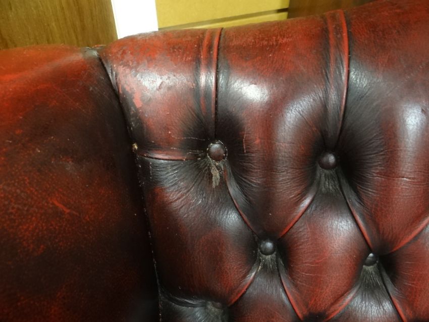 VINTAGE RED LEATHER BUTTON UPHOLSTERED WING BACK ARMCHAIRThere is a fair bit of general wear, scratches to the arms, the top and the sides.No rips or tears.All the buttons are present