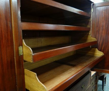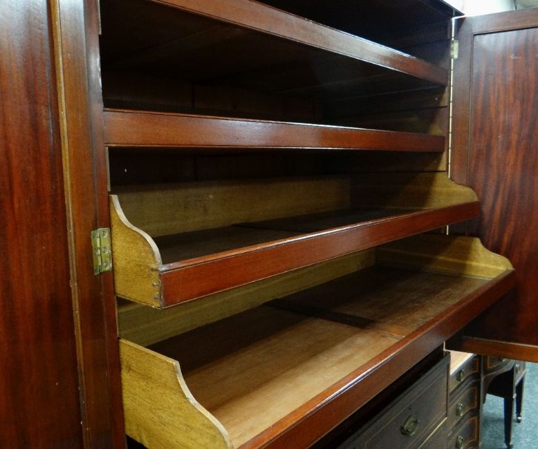 LATE 19TH CENTURY MAHOGANY & SATINWOOD STRUNG LINEN PRESS fielded doors enclosing five sliding shelves on a four-drawer chest base, turned front feet, 137 x 59 x 215cms