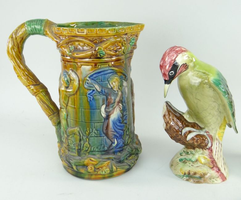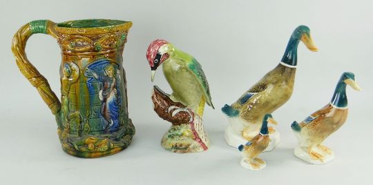 BESWICK FIGURINES including one woodpecker (1218), three mallard ducks and a French Majolica medieval style jug (5)