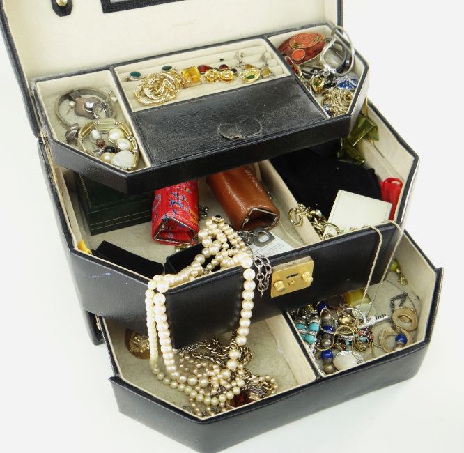 MIXED QUANTITY OF COSTUME JEWELLERY including 9ct gold mounted dress ring, possibly topaz, in stacking leatherette jewellery case