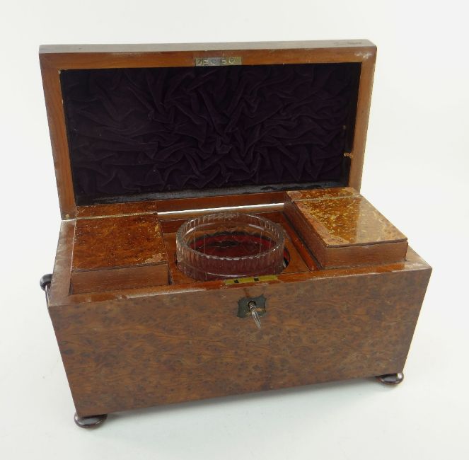 Condition Report: escutcheon lacking, handles loose / damaged, interior varnish worn to lids, some veneers lifting