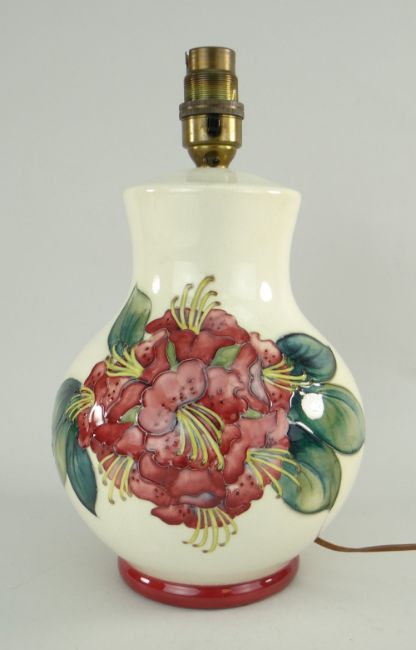 WALTER MOORCROFT POTTERY LAMP BASE, red Hibiscus pattern, 22cms high (fitted for electricity)