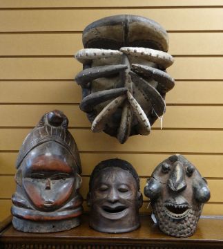 FOUR AFRICAN 'HELMET' MASKS including Wum mask, Mende bundu society mask, Makonde mask and Bete spider mask (4)