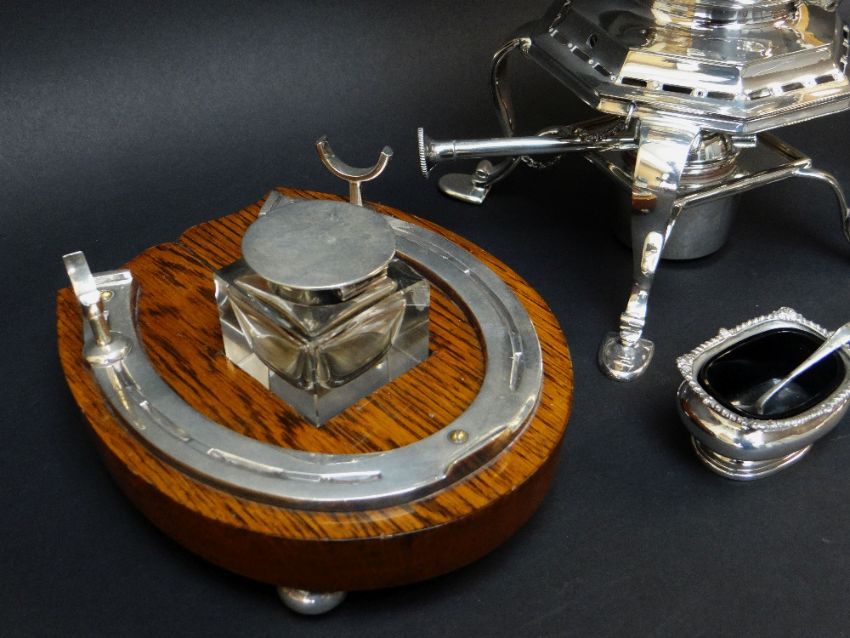 GROUP OF PLATE, including electroplated kettle, horse shoe inkwell, glass spirit flask and pair of cruets