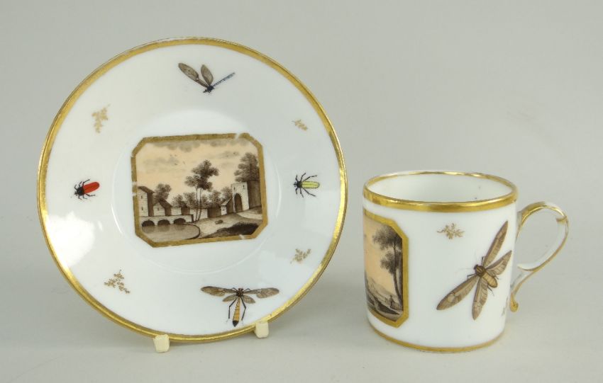 EARLY 19TH CENTURY PORCELAIN COFFEE CANISTER & STAND painted with rectangular vignette en grisaille with landscapes in the style of William Billingsley, border with scattered insects and gilt seaweed sprays, gilt lined rims