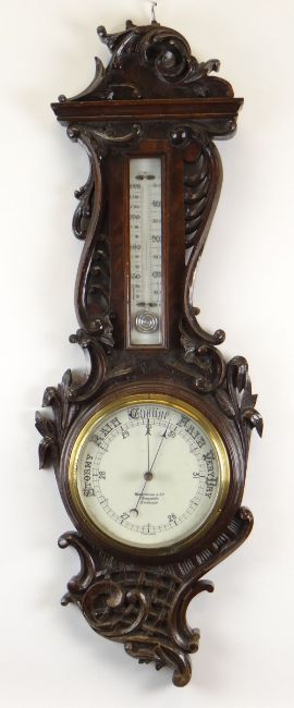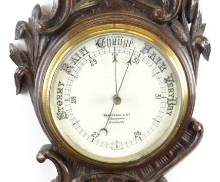 OAK CASED ANEROID BAROMETER, white porcelain dial signed Benetfink, Cheapside, London, rococo carved frame, neck with mercury barometer, 92cms high