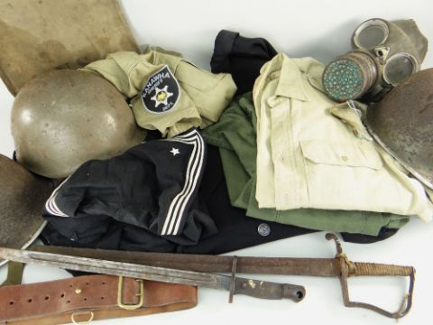 ASSORTED MILITARIA TO INCLUDE US MODEL 1917 BAYONET, home office gas mask, three helmets, belts, US bag, assorted shirts to include U.S.S. Sacramento, police & sheriff shirts and sword.