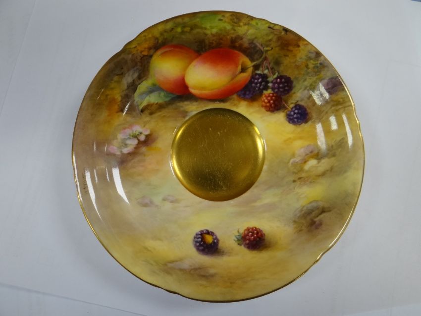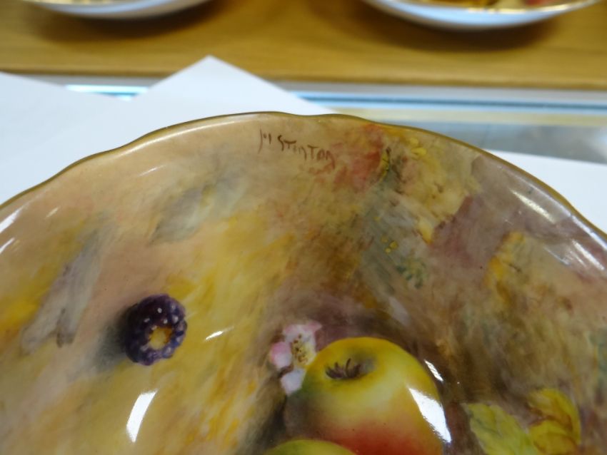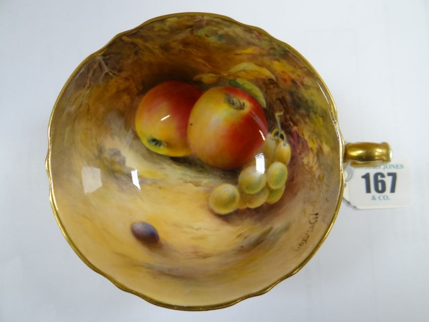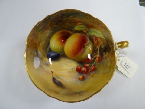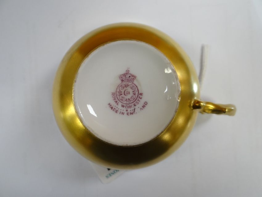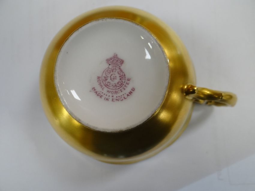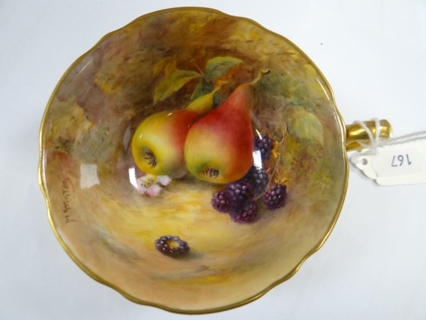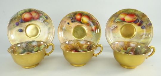 SET OF THREE ROYAL WORCESTER FRUIT PAINTED CUPS & SAUCERS, painted by Harry Stinton, depicting black berries, pears, apples, gooseberries, plumbs ETC, cups with gilded exteriors (6)I could not find any damage or restoration, just light surface scratches to the gilding, mainly in the centres of the saucers and very lightly on the outside of the cups.There is a small section of gilt loss on one of the cups near the handle. It is not a chip.All paint work looks good.
