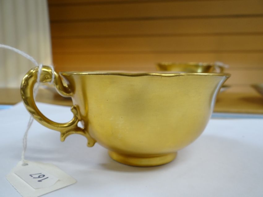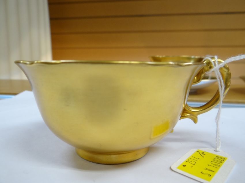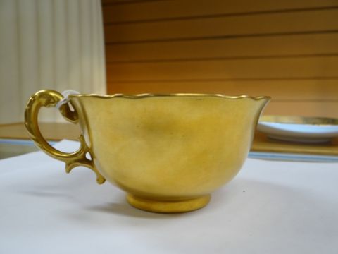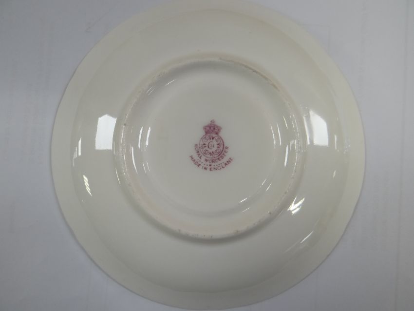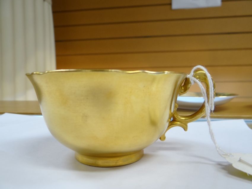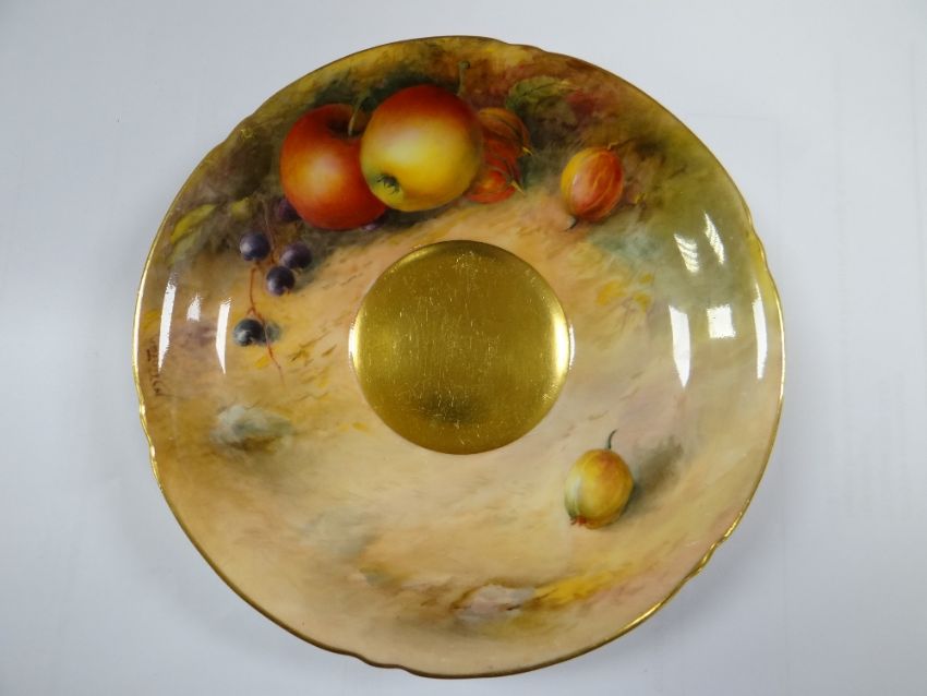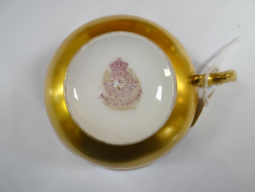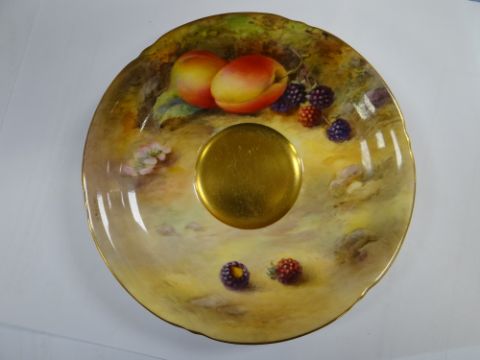SET OF THREE ROYAL WORCESTER FRUIT PAINTED CUPS & SAUCERS, painted by Harry Stinton, depicting black berries, pears, apples, gooseberries, plumbs ETC, cups with gilded exteriors (6)I could not find any damage or restoration, just light surface scratches to the gilding, mainly in the centres of the saucers and very lightly on the outside of the cups.There is a small section of gilt loss on one of the cups near the handle. It is not a chip.All paint work looks good.