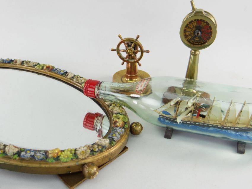 NOVELTY COPPER SHIP'S WHEEL CIGAR CUTTER, model binnacle similar, ship in bottle and oval mirror (4)