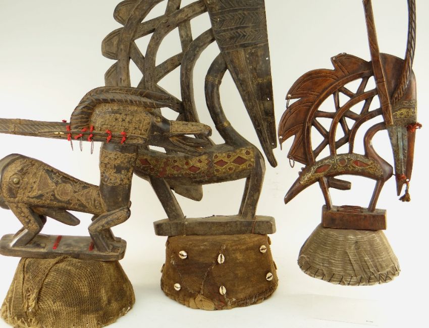 THREE BAMANA CHIWARA ANTELOPE HEADDRESSES all on woven fibre caps, tallest 146cms (3)