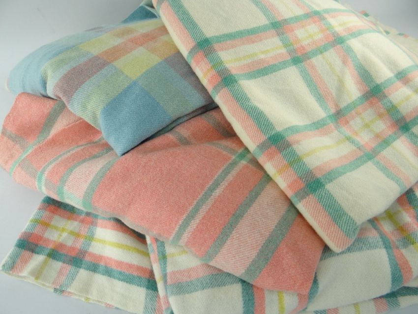 FOUR VINTAGE WOOLLEN BLANKETS, generally woven in cream, green, pink, yellow and blue ETC (4)