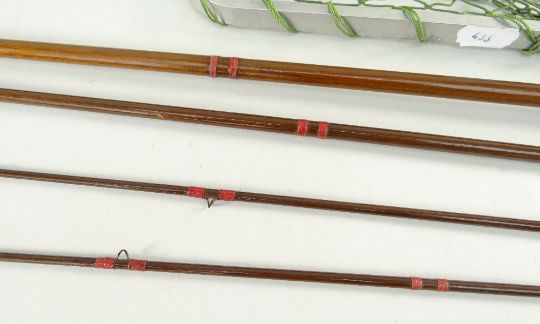 HARDY THREE-PIECE GREENHEART FLY ROAD with spare tip, 8ft 11in and a Hardy landing net (2)