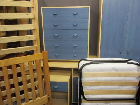 MODERN BEDROOM FURNITURE a quantity including a blue and lightwood effect suite of two door wardrobe, five drawer chest, dressing table and bedside cabinet, a modern pine single bed frame and a Jay-Be folding Z bed (clean condition)