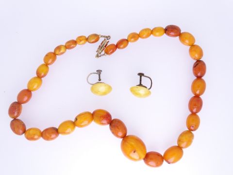 GRADUATED AMBER TYPE BEAD NECKLACE and a non-matching pair of earrings, 40cms L the necklace, largest central bead 2cms, 25grms gross