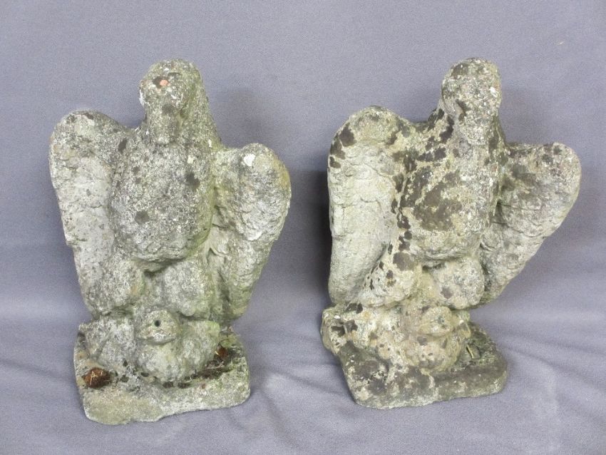 RECONSTITUTED STONE GARDEN ORNAMENTS, a pair, modelled as eagles standing on a duck's back, the duck's beak with water jet aperture, 47cms H, 33cms W